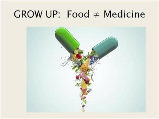 Medicine is for sick people and food is for everyone. We may use food as part of a therapy to “heal” a particular condition at a particular point in time, but that is not the same thing as a public health paradigm. We put casts on broken legs, but we don’t recommend that everyone wear casts in order to prevent legs from breaking.