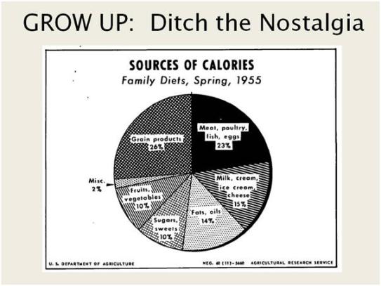 An ancestral framework can help us analyze the differences between how this food environment may be similar to or different from our current one, without having to invoke a past that didn’t exist, as the plant-based folks must in light of this information—or a past that is so distant that it’s hard to say what we really know about it [as the paleo folks must]. On the other hand, the 1955 –style 50/50 diet looks remarkably familiar. It’s not that hard. Or is it?