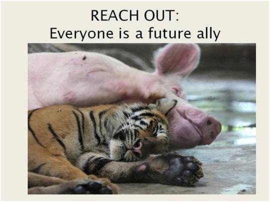3) Development of a dense social networks that can work collectively against a common target. In order to create these alliances, we are going to have to begin REACHING OUT.