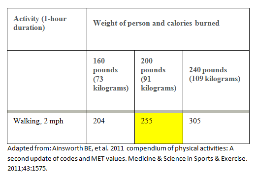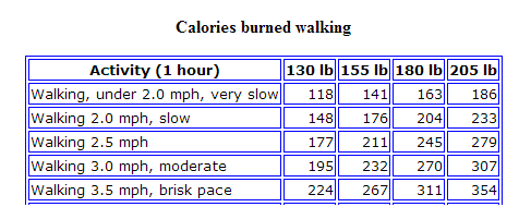 Okay, let’s say I add 500 calories of activity to my day. Using the handy-dandy chart below (also from the Mayo Clinic), I find have to walk for 1 hour and 45 minutes in order to burn 533 calories.