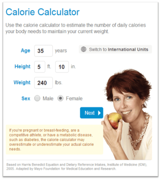 Let’s say I’m a big fat newbie. Let’s say I’m a 35-year-old, 5’10” OBESE female who weighs 240 pounds (not my current age or weight, but that’s approximately where I started in my own weight loss journey). I already know that I need to “eat less and move more” in order to lose weight, because that’s what my doctor told me. I go to a trusted source, the Mayo Clinic, for guidance (for those of you who want to play along at home, here’s the Mayo Clinic calculator).