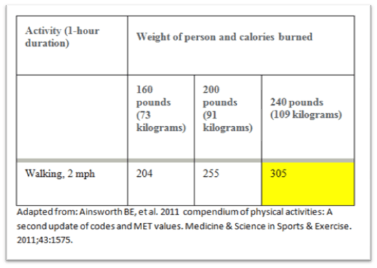 Okay, 1550 calories/day is not a lot, but it’s more than 1350 calories/day I was eating before.* I’m not sure why this is, but I’ll take it, because–even though I am a “smaller vessel”–clearly there must be some calorie magic at work. But while I may be able to eat (a little) more, on the other hand, now I have to exercise even more because my ability to burn calories has decreased (see chart below). Now I have to walk for 2 full hours each day in order to get my 500 calories out.