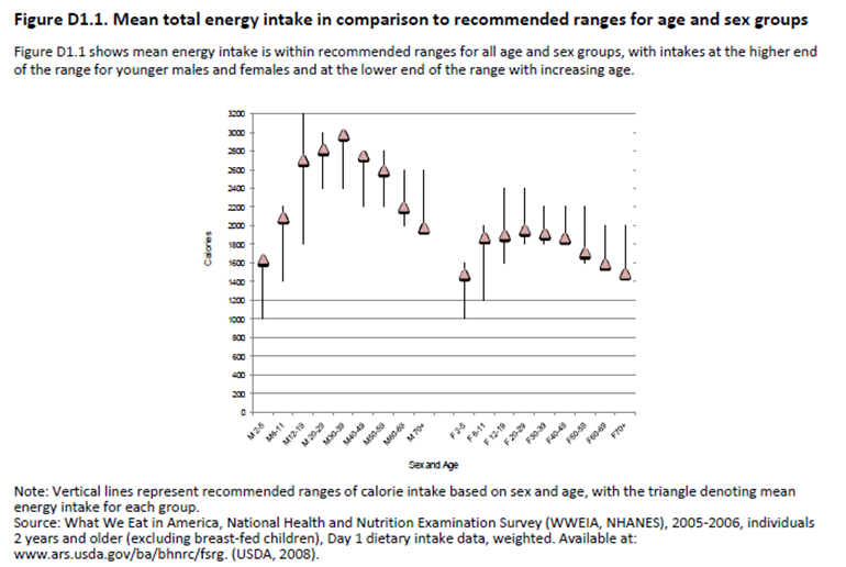 I do understand the reluctance to use dietary intake data collected by NHANES, as all dietary intake data can be unreliable and problematic (and not just the kind collected from fat people). But I guess maybe if you’ve decided that Americans are being “highly inaccurate” about what they eat, then you figure it is okay be “highly inaccurate” right back at Americans about what you’ve decided to tell them about what they eat. Because using food availability data and calling it “consumption” is to put it mildly, highly inaccurate, by a current difference of over 1000 calories.